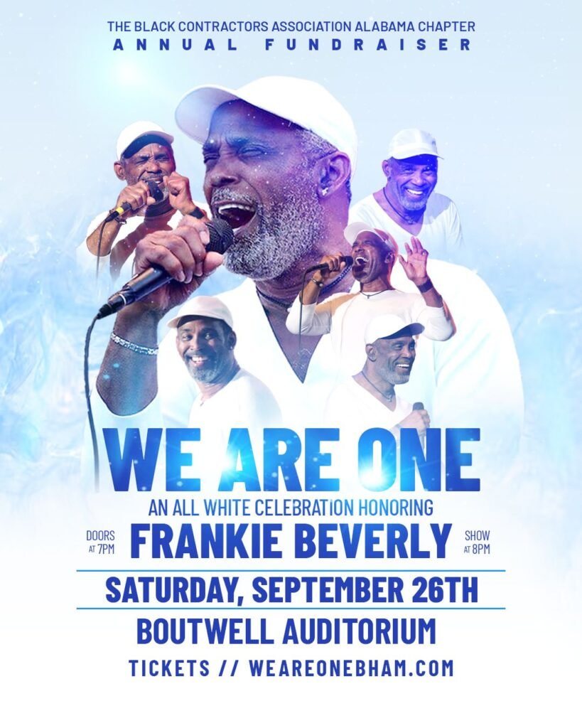Join the Black Contractors Association – Alabama Chapter for an unforgettable evening of music, unity, and tribute at their Second Annual We Are One All-White Celebration, honoring the timeless legacy of the legendary Frankie Beverly. This elegant all-white affair will feature electrifying entertainment throughout the night, including performances by Jubu Smith, Yung Vokalz and The Movement, and an energetic set from DJ Chocolate, bringing soulful rhythms and vibrant celebration to the stage.